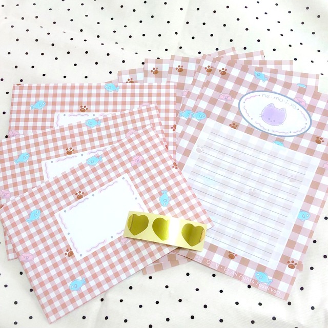 ふわふわのこねこと、だいすきなおさかな ちいさなあしあと、えさのさら。 なでてくれてもいいけど、 わたしがいいたいことはひとつよ ねむいったらねむいの。 ・ne mu i yo・にゃんこのレターセットです! とってもレトロファンシーな雰囲気のレターセットができました♡ お友達やご家族へのすてきなお手紙Timeのおともに♡コレクションなどにも☆ 別売のシールと合わせてご使用いただいてもかわいいです〜* (マット紙) ・セット内容・ 便箋6枚/封筒3つ/シール3つ 封筒サイズ:洋2型 すべてハンドメイドでの製作になります。 なるべく肉眼でみる色とおなじにしていますが、ご使用のモニターによって違うカラーに見える場合がございます。 また紙にもともとある黒や茶色の点のようなものがある場合がございます。 完璧なお品物ではないことをご了承くださいませ。