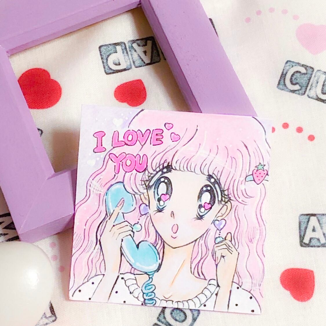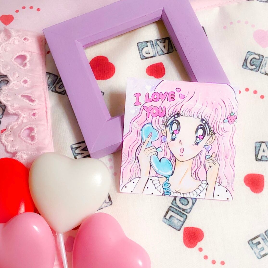 イラストは手書きで、色塗りは色鉛筆メインです☆ I LOVE YOUの文字はネオンピンクで塗りました!