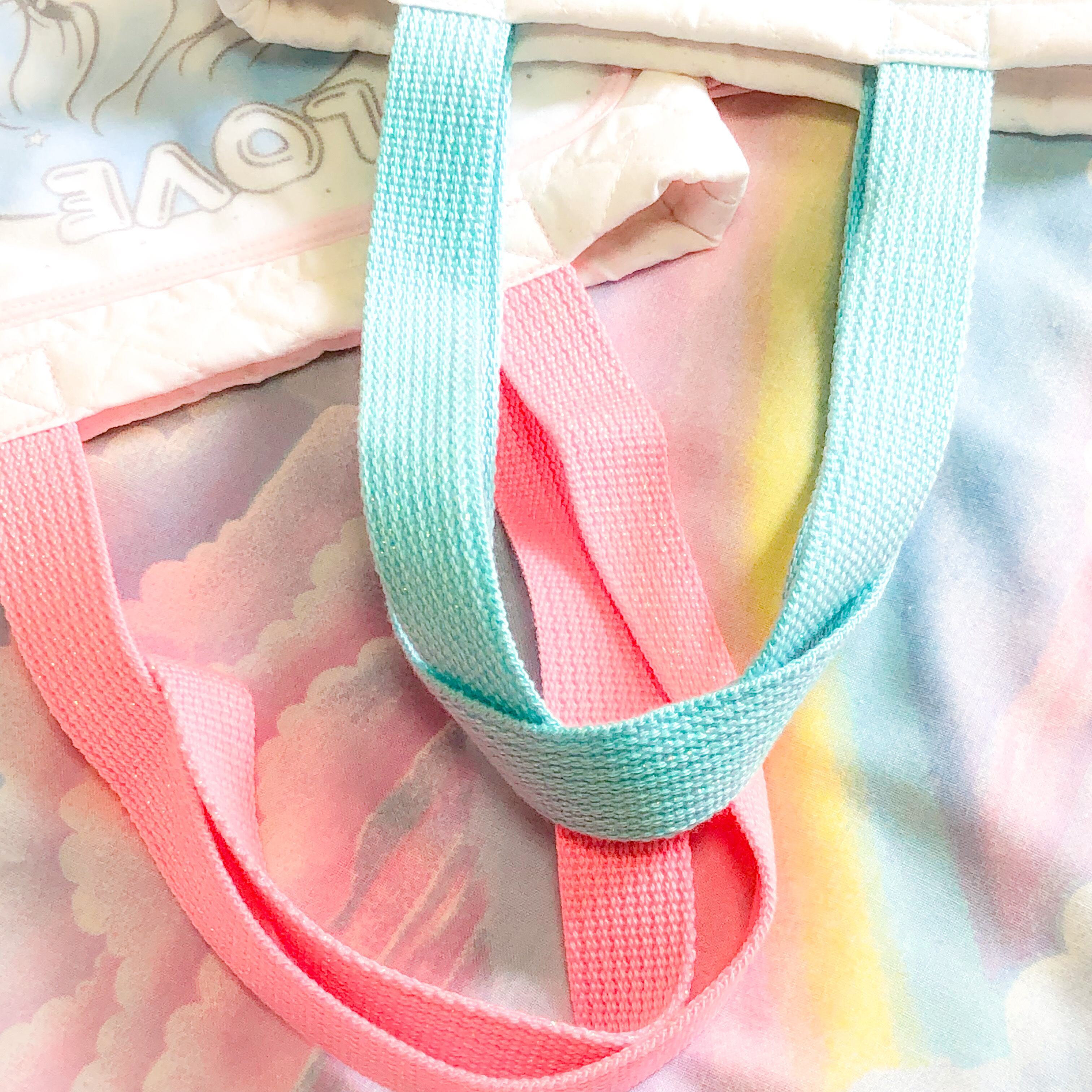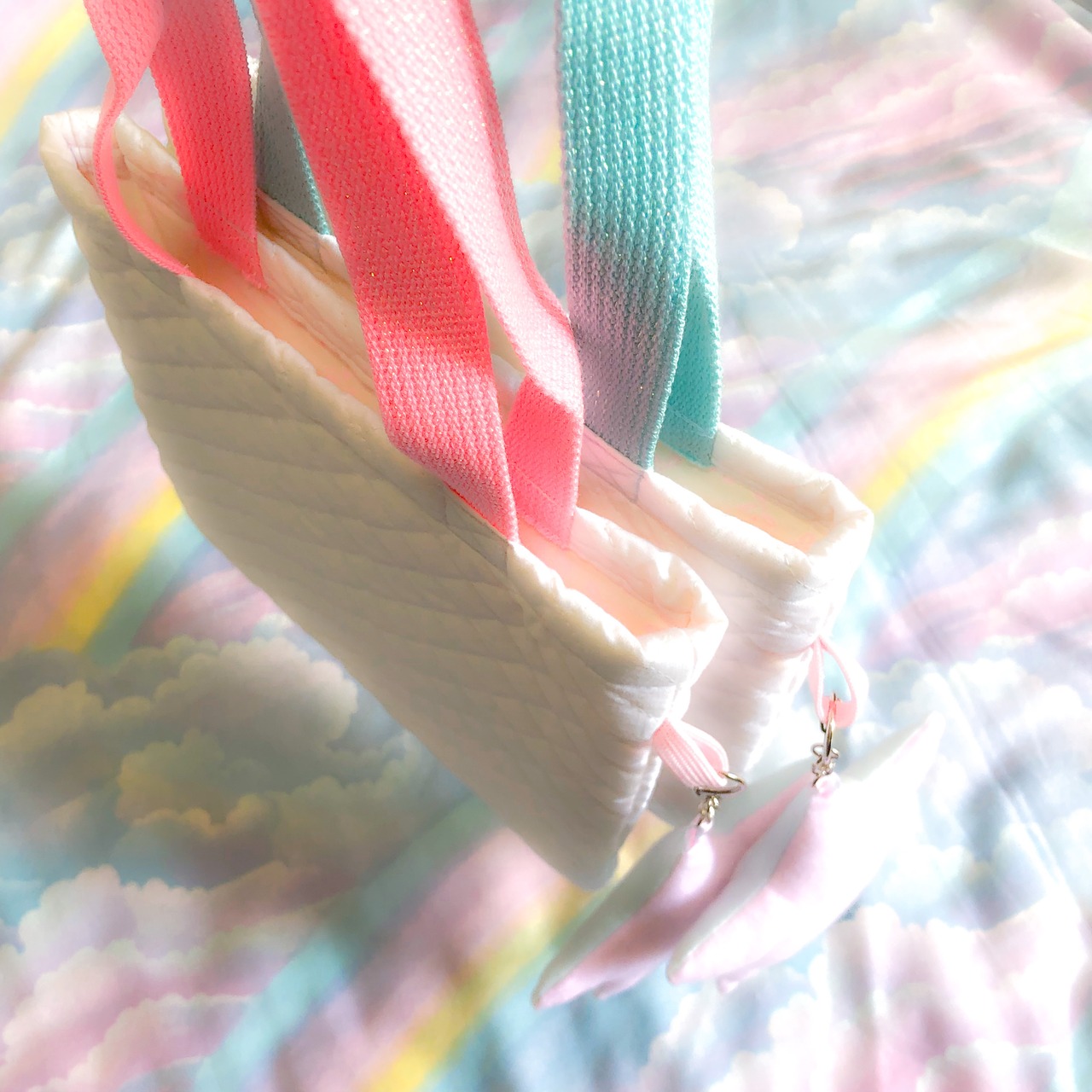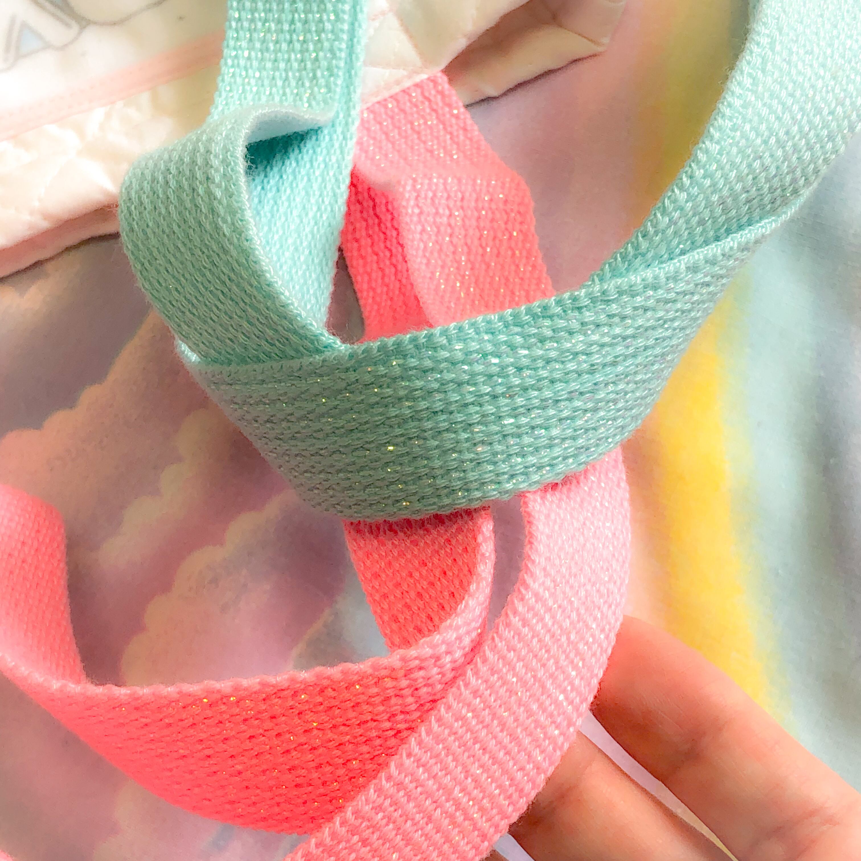 それぞれピンク/ミズイロのふちどりと合わせて持ち手のひものカラーも変えました。