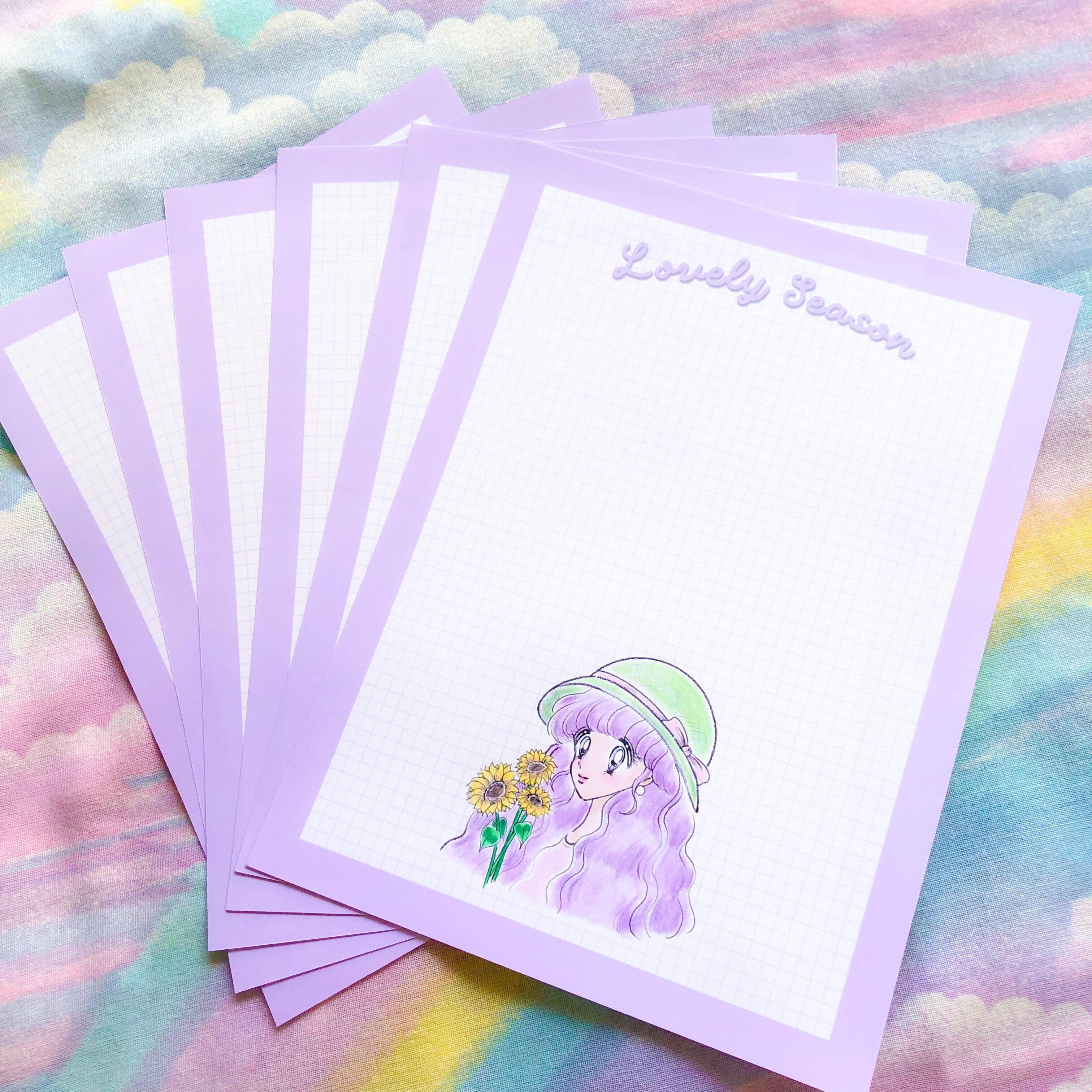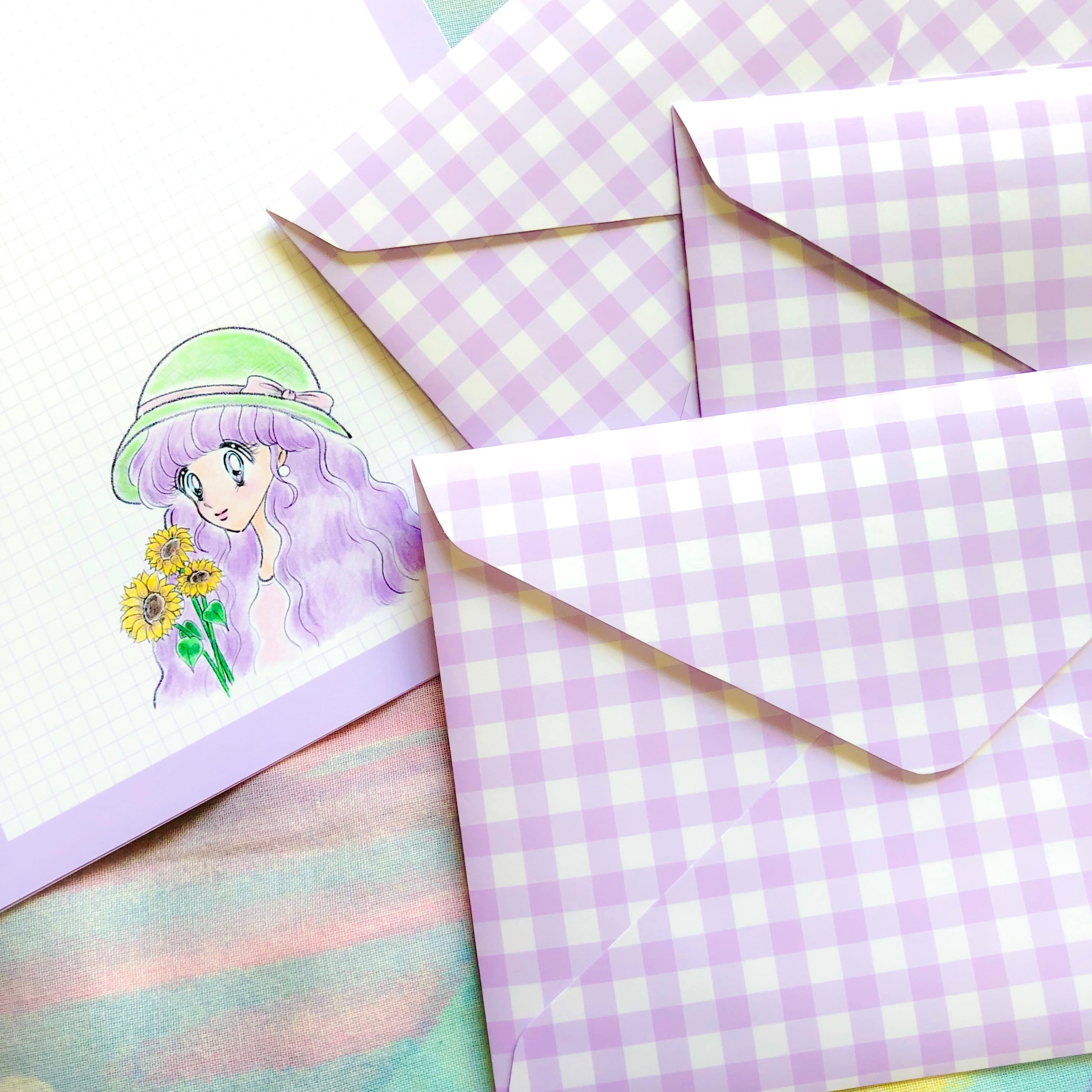ラベンダーをベースに方眼になった便箋とラベンダーのギンガムチェックの封筒のセットです(ゝ。∂)